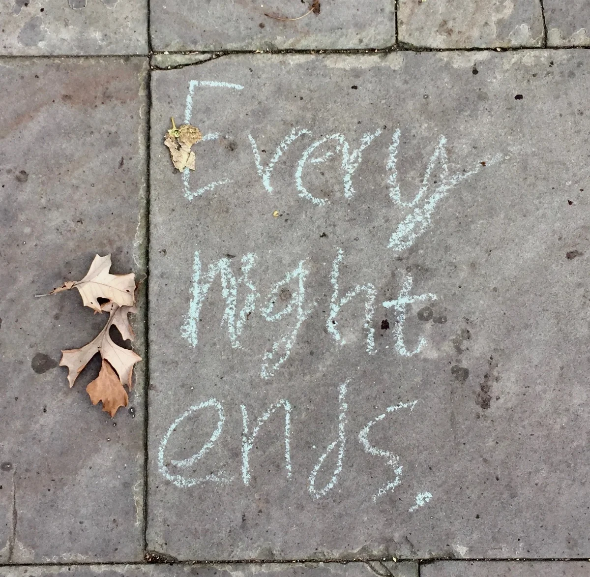 The walkways that crisscross the University of Chicago campus are usually well-groomed, unmarked. But in the days following the 2016 presidential election, they became a riot of chalk: slogans, quotes, and hashtags, scribbled in different colors, sizes, and scripts. One graffito in particular stopped me in my tracks. It read: “Every night ends.”